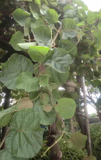 草むしり(毟り)もそうですが、テーマはキウイとススキです。キウイの蔓(つね)は元気旺盛です。それ用の棚はあるものの、煙突、松、カエデ等、所かまわず絡みつきます。この枝の剪定(せんてい)がよく解からないでいます。