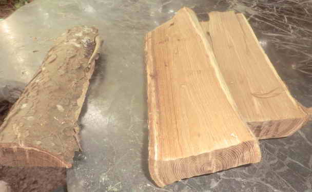 その下拵え(したごしらえ)をします。単に薪(まき)小屋に積んでいるエンジュを鉈(なた)で割るだけです。しかし、振り下ろす鉈が期待する場所に命中しないことが切ないです。割れた結果をみて今後の方針を決めることになります。