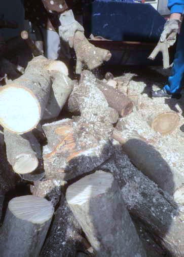 朝、『木が届いていますよ。』と、K社長がお出でになります。薪材(まきざい)です。遠方の庭木をH氏が運んできたものです。太いものは直径1尺以上もあります。この処理には気合が必要です。