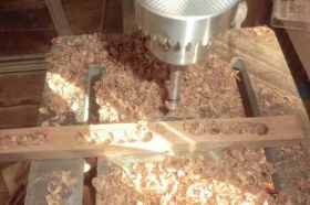 次に、鉦出ししたものを更に鉈(なた)でパカンと割ります。そして試作と同様に、割った両者の内側をフォスナービットで掘ります。鉛を流す空間の確保です。