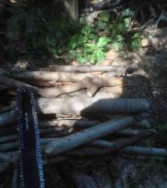 直径3~4cmを境にして方法を変えています。太いものはチェンソーを使います。20本ほどをまとめて伐ります。3本ほどの台木に直交させて綺麗に整頓したものを伐ります。ほぼ一瞬にできる作業ですが、まとめるための時間を要します。