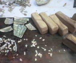 今日の工房活動は「螺鈿(らでん)」の準備です。使う貝はアワビ(鮑)です。意外に平面の少ない貝です。細かくすることで平面らしくなります。昨日からこの作業をしているところです。