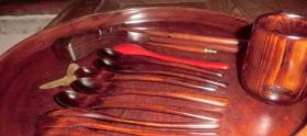 ここ暫らく続いた「漆塗」の本来のテーマは「弁当箱」と「筆箱」でした。しかし、余った漆でさまざまな小物にも及んでいます。グイ呑み、箸、ティースプーン、筆置き等です。この中の箸とティースプーンの木地はH氏から譲られたものです。