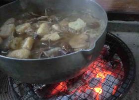 これは生のまま冷凍保存しているものです。凍ったまま鍋に入れます。単に糸コン、ゴボウ、ブタ肉、油揚げ等を入れた醤油味です。それぞれの風味がそのまま残っています。少し不思議な世界です。